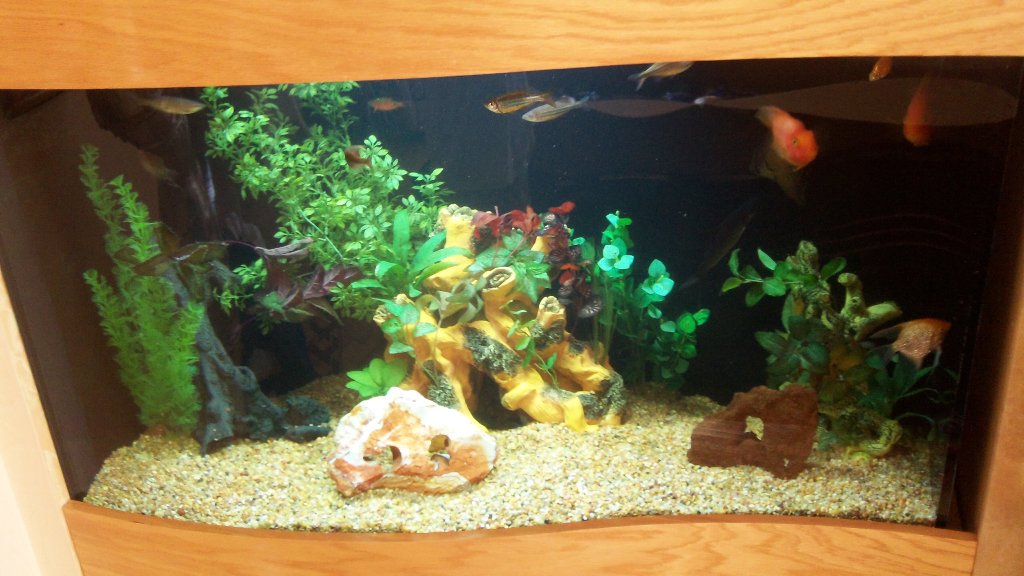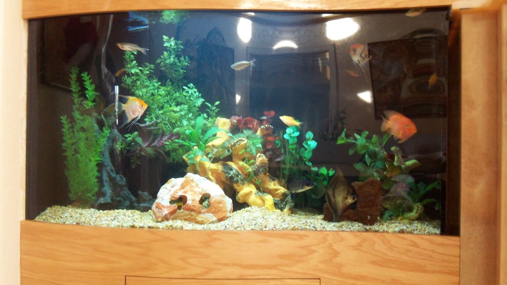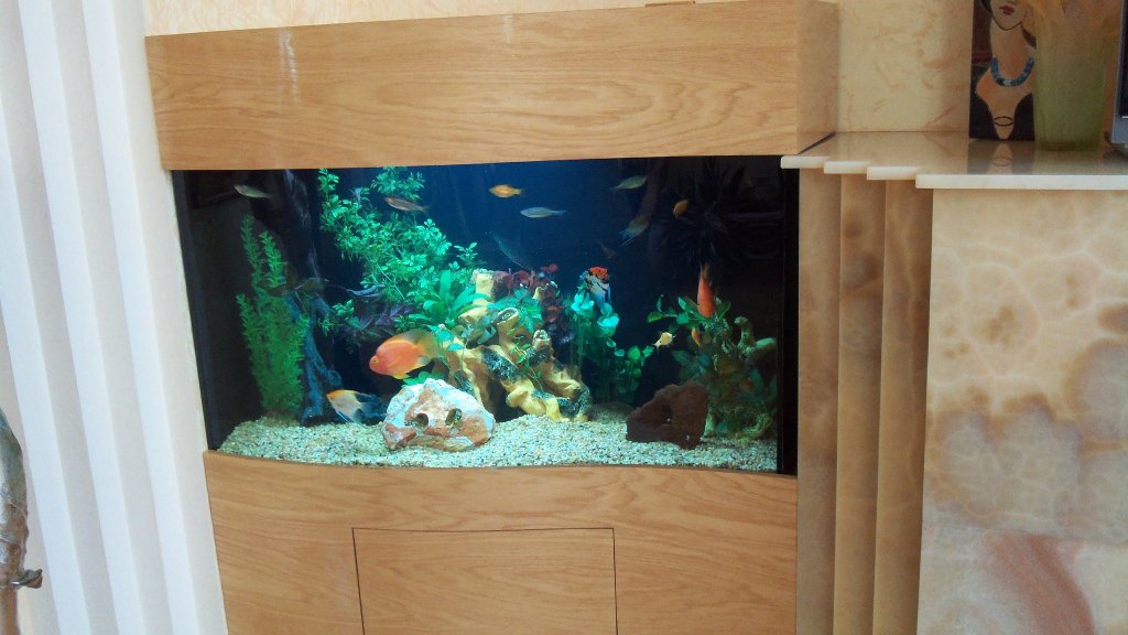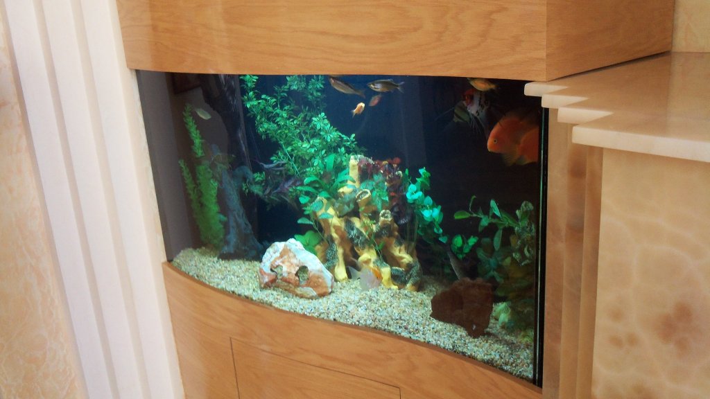 This aquarium starts off at 18″ width on one end then bows out to 24″ at the other end. It was a perfect accent to the homeowner’s decor. The fish are freshwater community fish with a few specials additions including 2 mono sebae, 3 angelfish and a number of other smaller schooling fish.